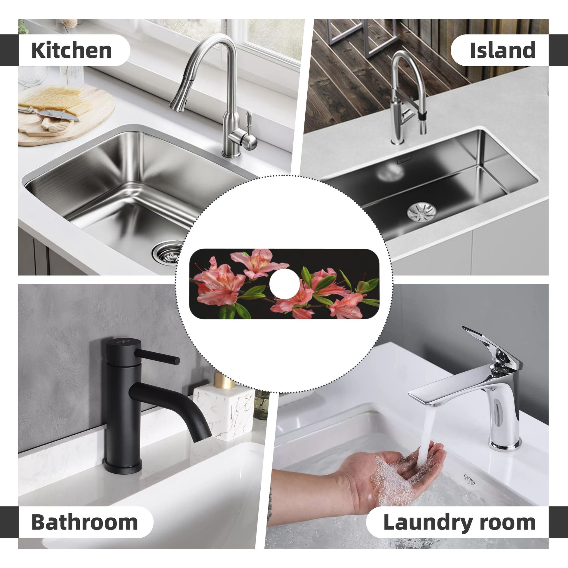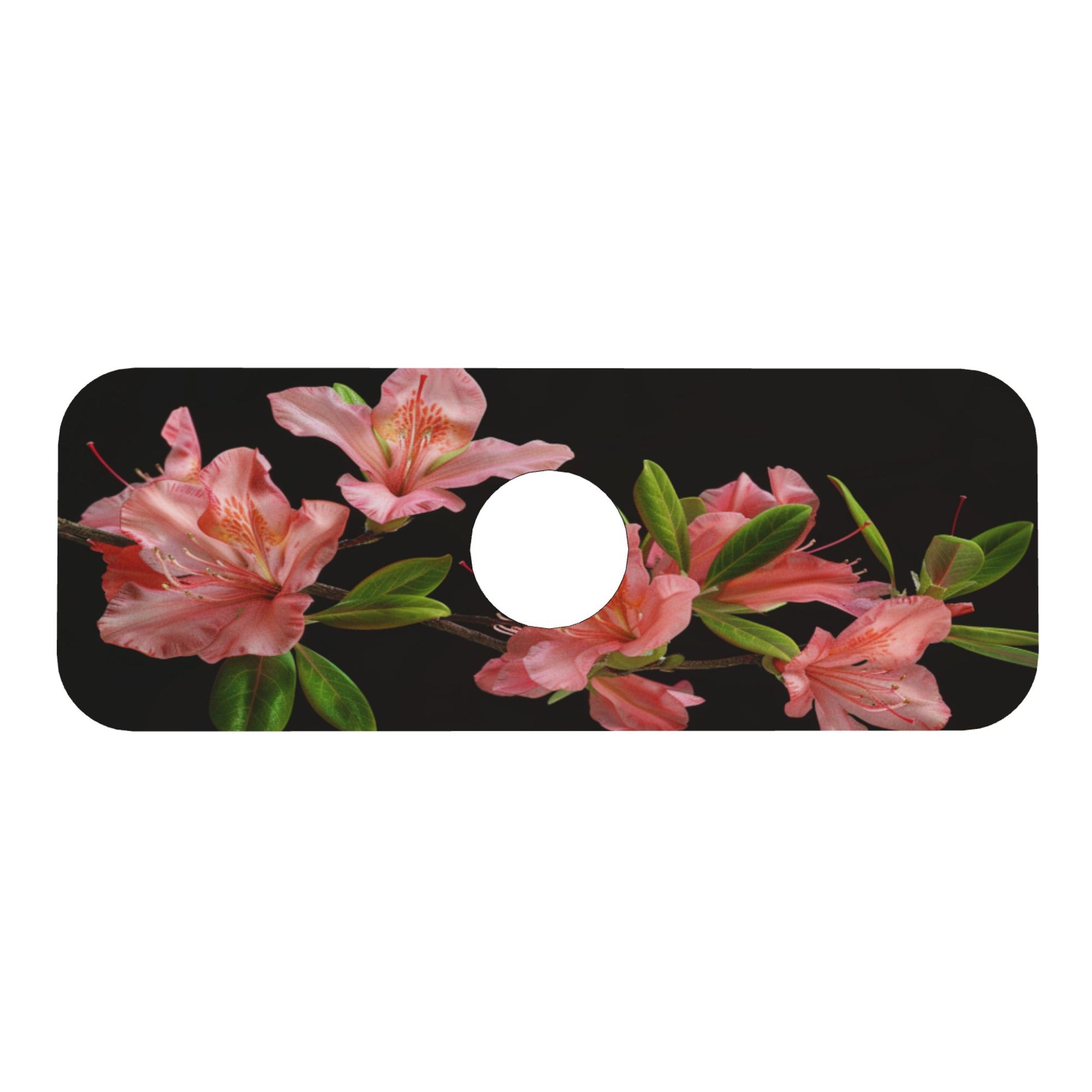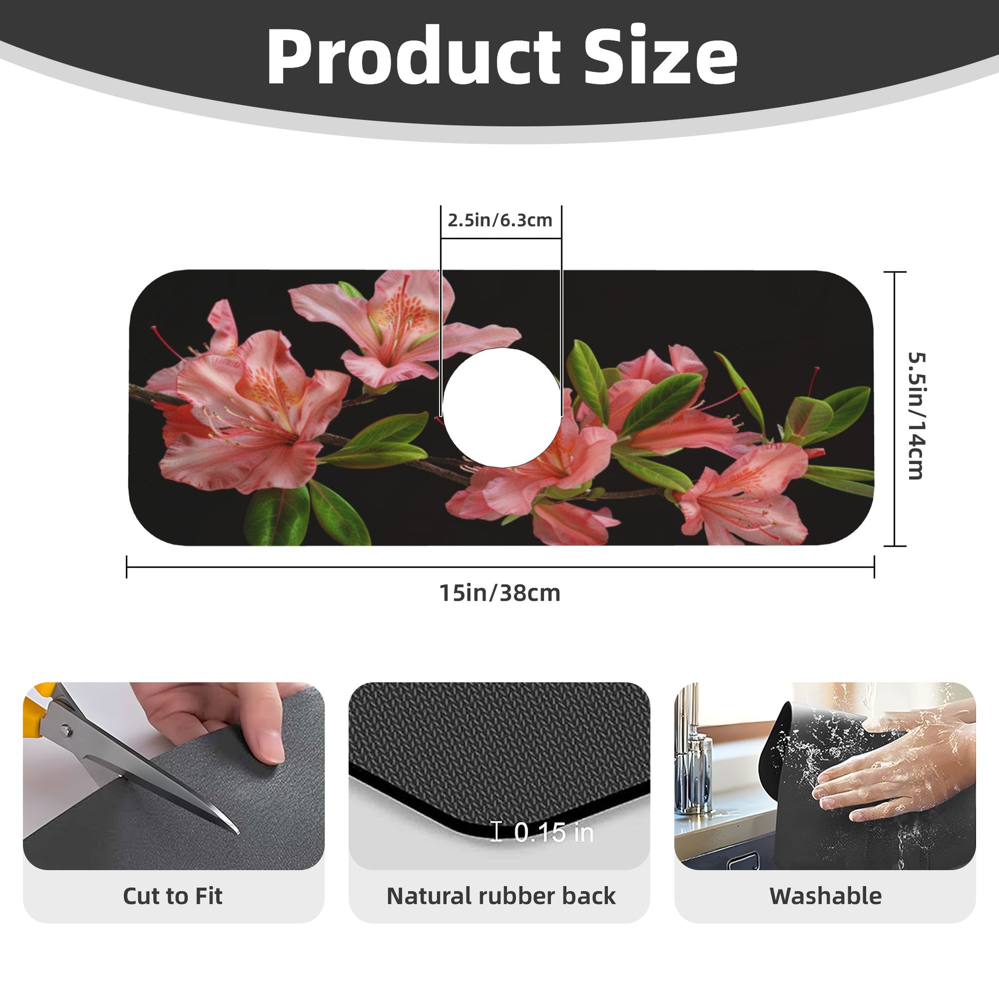 Azalea Flower Faucet Absorbent Mat – 15"x5.5" Sink Splash Guard | Quick-Dry & Washable | Natural Rubber Back | Cuttable Design | Pink Floral on Black