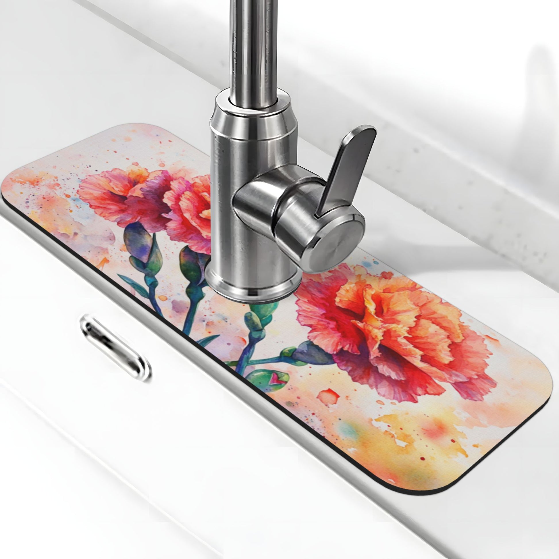 Floral Carnation Faucet Absorbent Mat – 15"x5.5" Sink Splash Guard | Quick Dry & Washable | Natural Rubber Backing | Cut to Fit | Romantic Flower Design