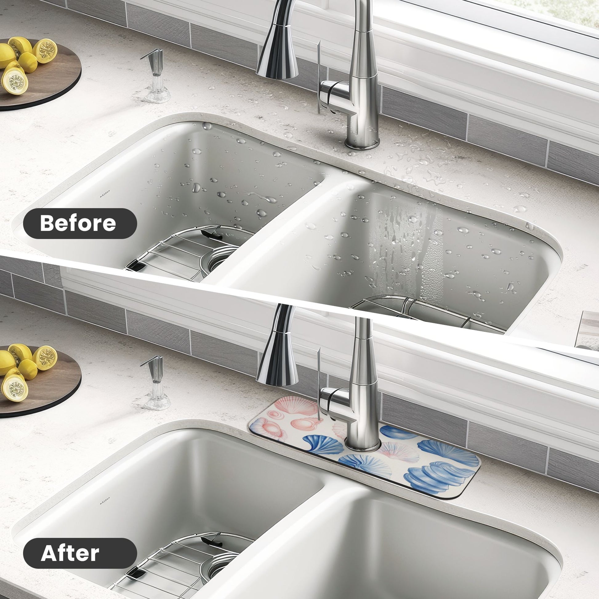 Seashell Pattern Faucet Absorbent Mat – 15"x5.5" Sink Splash Guard Pad with Natural Rubber Back | Cuttable & Washable Counter Protector for Kitchen & Bathroom